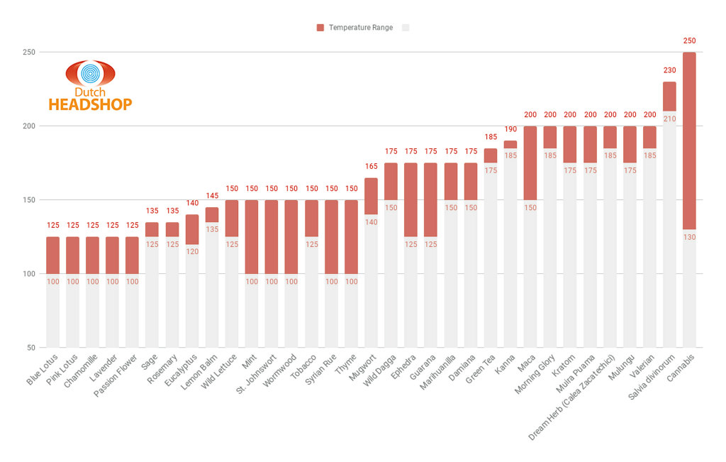 Herbs too contain various substances which are all released at different temperatures in your vaporizer. Without discussing all herbs in detail, we want to give you some suggestions for good vaping temperatures. Check the bar chart below.