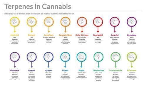 Weed contains over 480 different substances - all things that the plant creates itself. If you vape or smoke weed, you increase the temperature which releases these substances. This higher temperature makes some substances undergo a reaction first. Take CBDA and THCA for example. As soon as these are heated, they will be converted into CBD and THC. These substances have other characteristics as well. THCA doesn’t get you high, but if you remove the ‘A’ that’s when the party gets going. These are some of the substances in weed and their effects [4,5,6,7]: